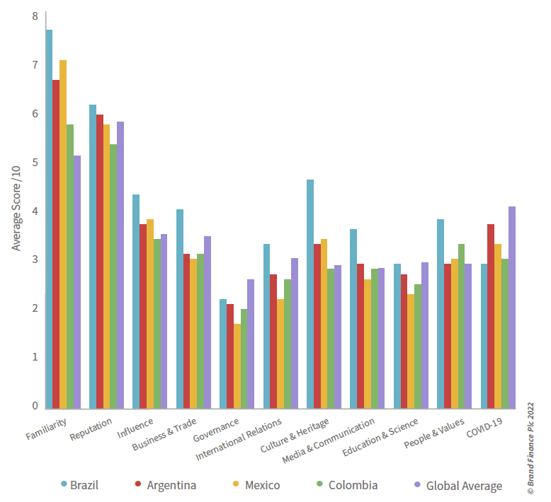 In the ‘Reputation’ pillar, Brazil does not rank as highly as in the previous dimensions, appearing only in the 30th position. Brazil, with its score of 6.1, is alongside Poland and Qatar, with scores above global average of 5.75. Even so, Brazil is the best-positioned Latin American nation in this criterion.