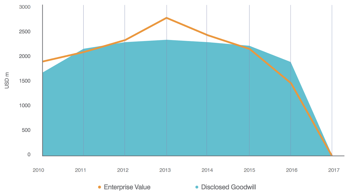 Consider that the average share of market enterprise value disclosed as goodwill for the global set of trading companies between 2011-2017 was a mere 6% and join the critics of KPMG that wonder why goodwill was not impaired.