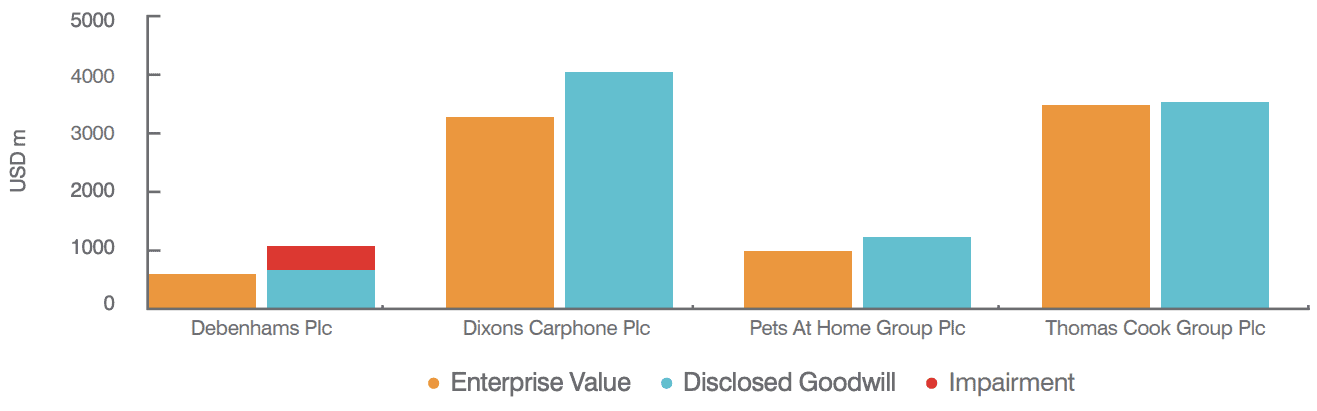 Following the completion of our analysis, the new finance director of Debenham’s took a decisive impairment against goodwill, lowering the carrying amount by almost $400m, resulting in cancelled dividends and a pre-tax loss of over $600m. 92 planned store closures at Dixons, upward pressure on payroll costs at Pets at Home, and the recent 25% plunge in shares at Thomas Cook; 2018 has been a tough year so far for these companies too.