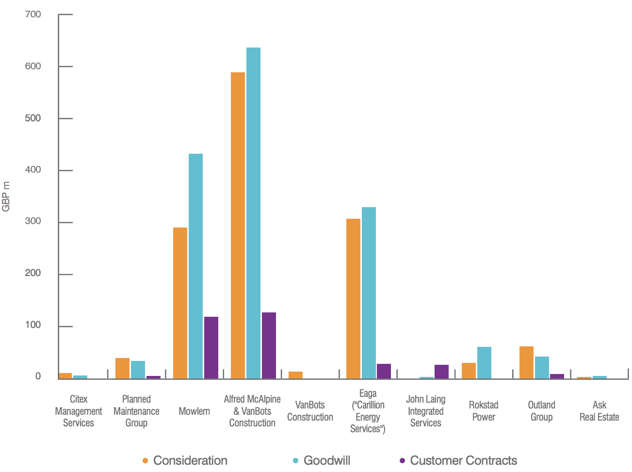 As demonstrated, this was not the case with Carillion. It is reasonable to assume that the original recognition of goodwill was not just representative of synergies. A glance at the FVE details of Carillion’s most recent acquisitions in the above graph demonstrates the exaggerated amount allocated to goodwill.