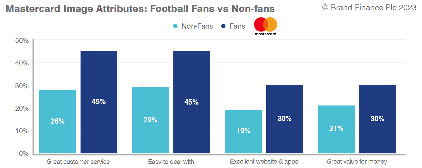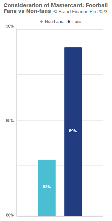 Brand Finance found that consideration of the Mastercard brand had an uplift of 6% among football fans. This market research is not showing respondents who have reported being exposed to / engaged with the particular partnerships, but assumes exposure among followers of the sport in general; this gives a conservative view of the impact, but we can see that the partnerships are nonetheless delivering benefits to the brand.