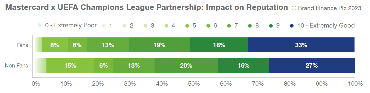 Brand Finance’s 2023 Global Brand Equity Monitor study shows Mastercard’s near 30-year partnership with UEFA Champions League has had a positive impact on their overall reputation. 33% of football fans rating it a 10 for reputation, vs 27% of non-fans, but also only 10% of fans rating it a 5 or below compared to 20% among non-fans.