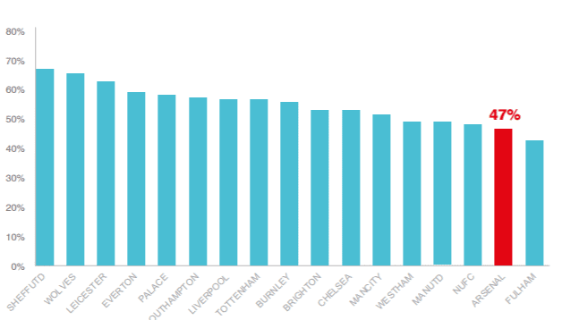 Our latest fan research indicates only Fulham fans were less likely to agree with the statement ‘The club appreciates its fans’ than at Arsenal.