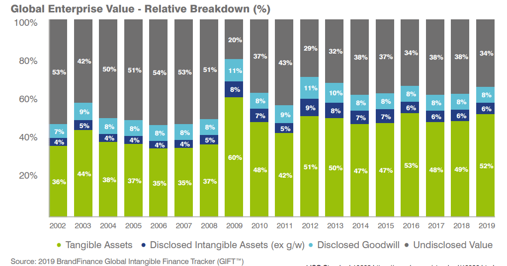 Brand Finance’s 2019 edition of GIFT™ reports that intangible assets now account for 48% of overall enterprise value.