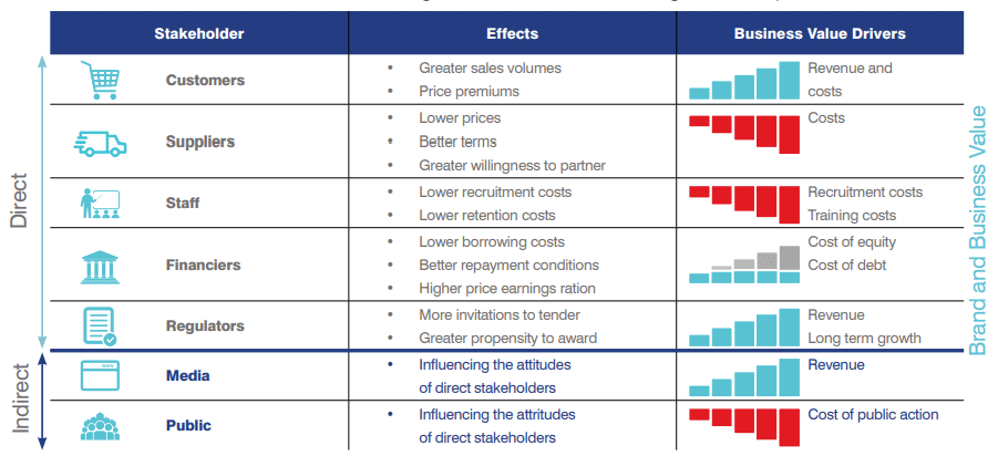 This coincides with the widening of the role and influence of marketing, given the way in which brands can influence stakeholders beyond customers including employees, suppliers, partnerships, providers of capital, media and government. The benefits of a performing brand are not only increased demand and distribution, but also lower costs of materials, personnel, debt and equity.