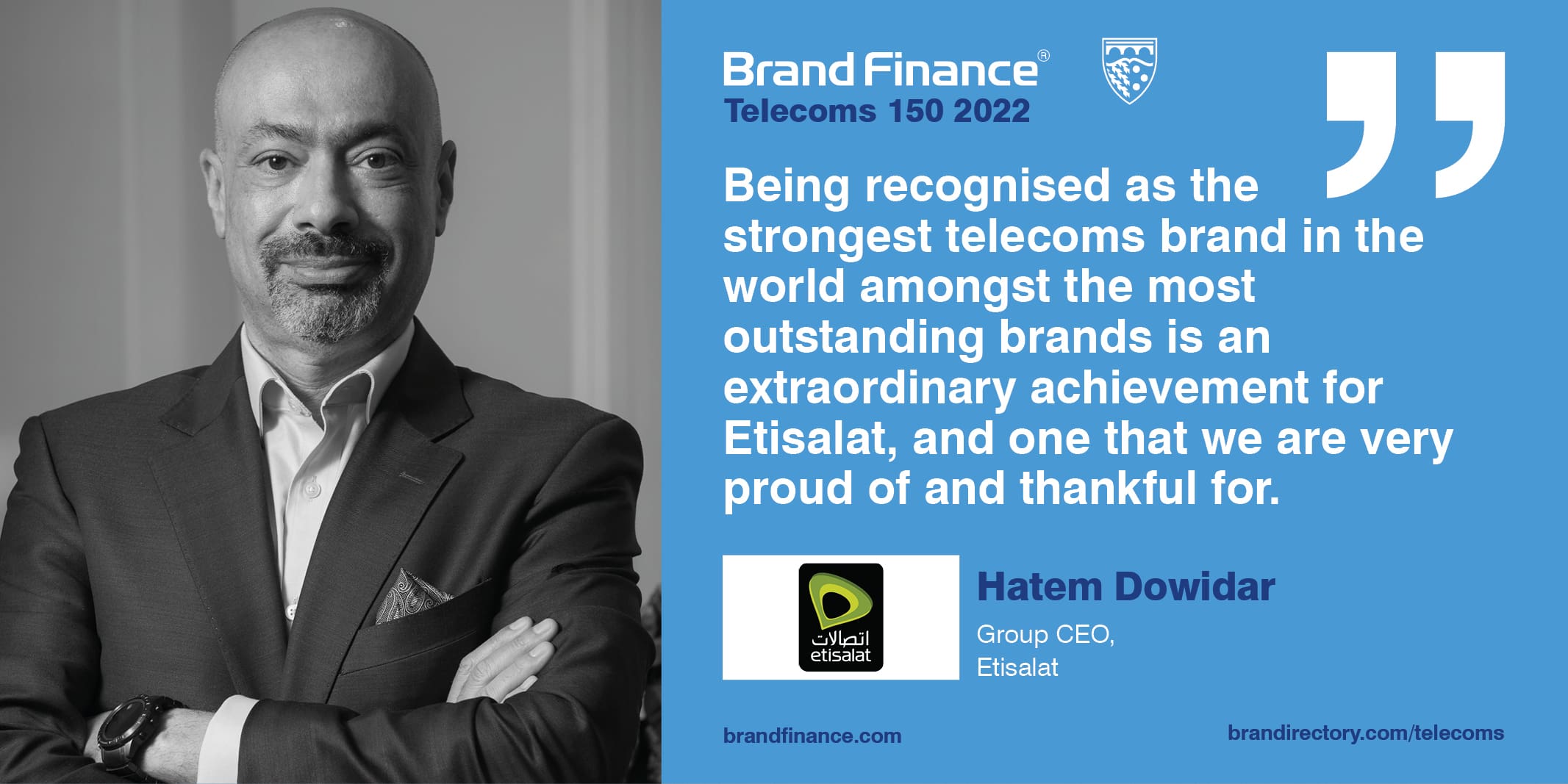 Late last year, we conducted brand equity tracking to feed into our valuations, which revealed that 88% of respondents were aware of Etisalat’s achievement, and of those, 96% agreed that it represented their experience with the carrier. This awareness helped to increase other perception scores included in Brand Finance’s research, such as innovation, quality and reputation, helping Etisalat to become the world’s strongest telecom brand in 2022.