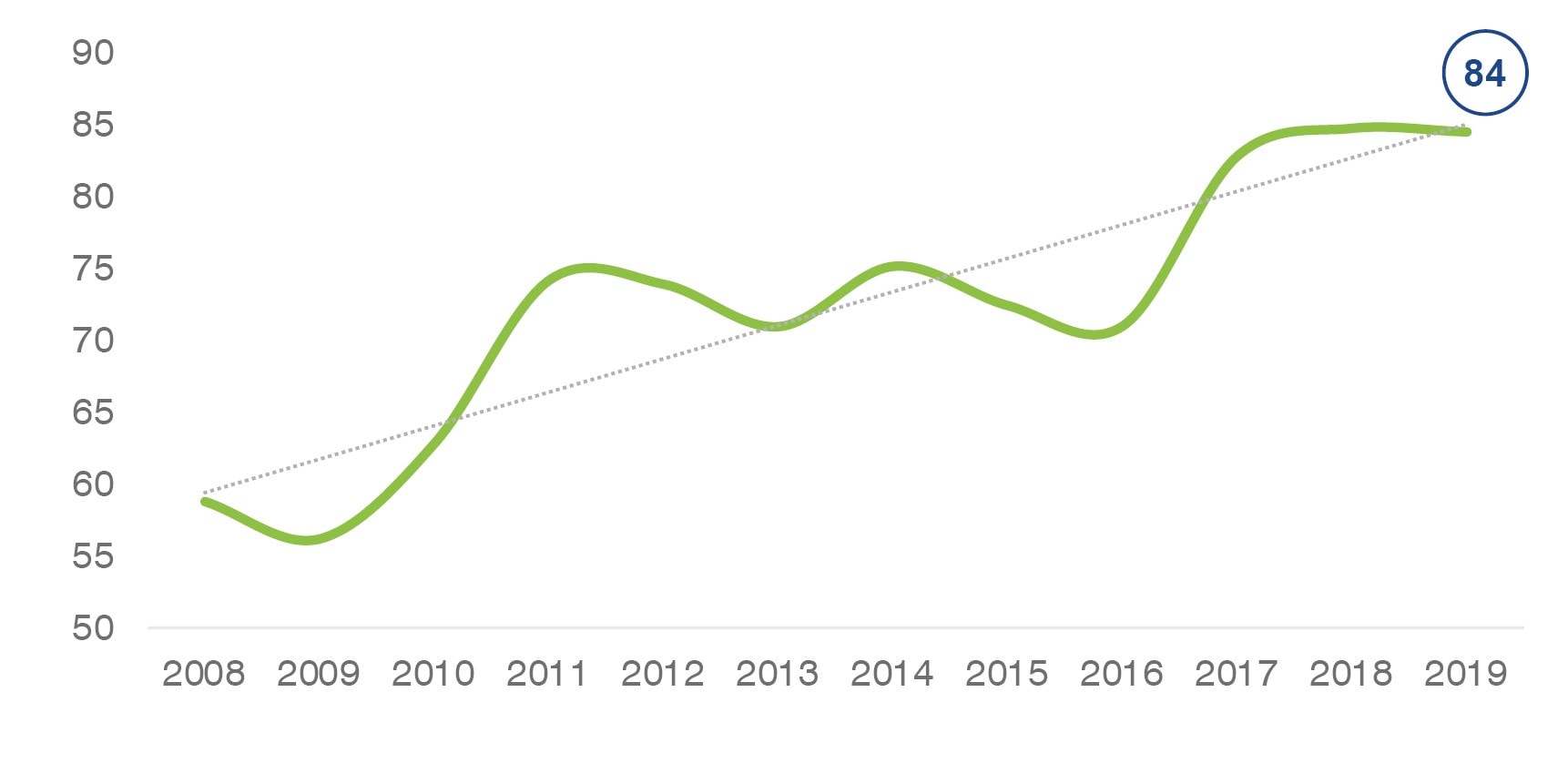 The backbone of TELUS’ branding success is in its brand strength. TELUS is the strongest Canadian telco brand and third strongest brand in the Canada 100 table, with a brand strength index score of 84.4 and brand rating of AAA-.