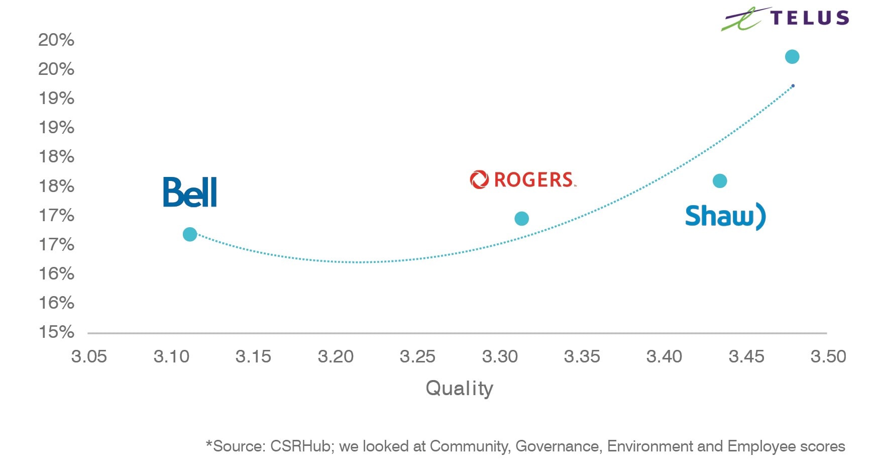 Corporate social responsibility, or what we call ‘Social Purpose’, is core to what we stand for as a brand. At TELUS, our social purpose is to leverage our world-leading technology to enable remarkable human outcomes in our all-connected world. Social purpose is built into our strategy, technology investments and culture. It is also explicitly aligned with our brand and the promise it represents: innovation, simplicity and driving social change.