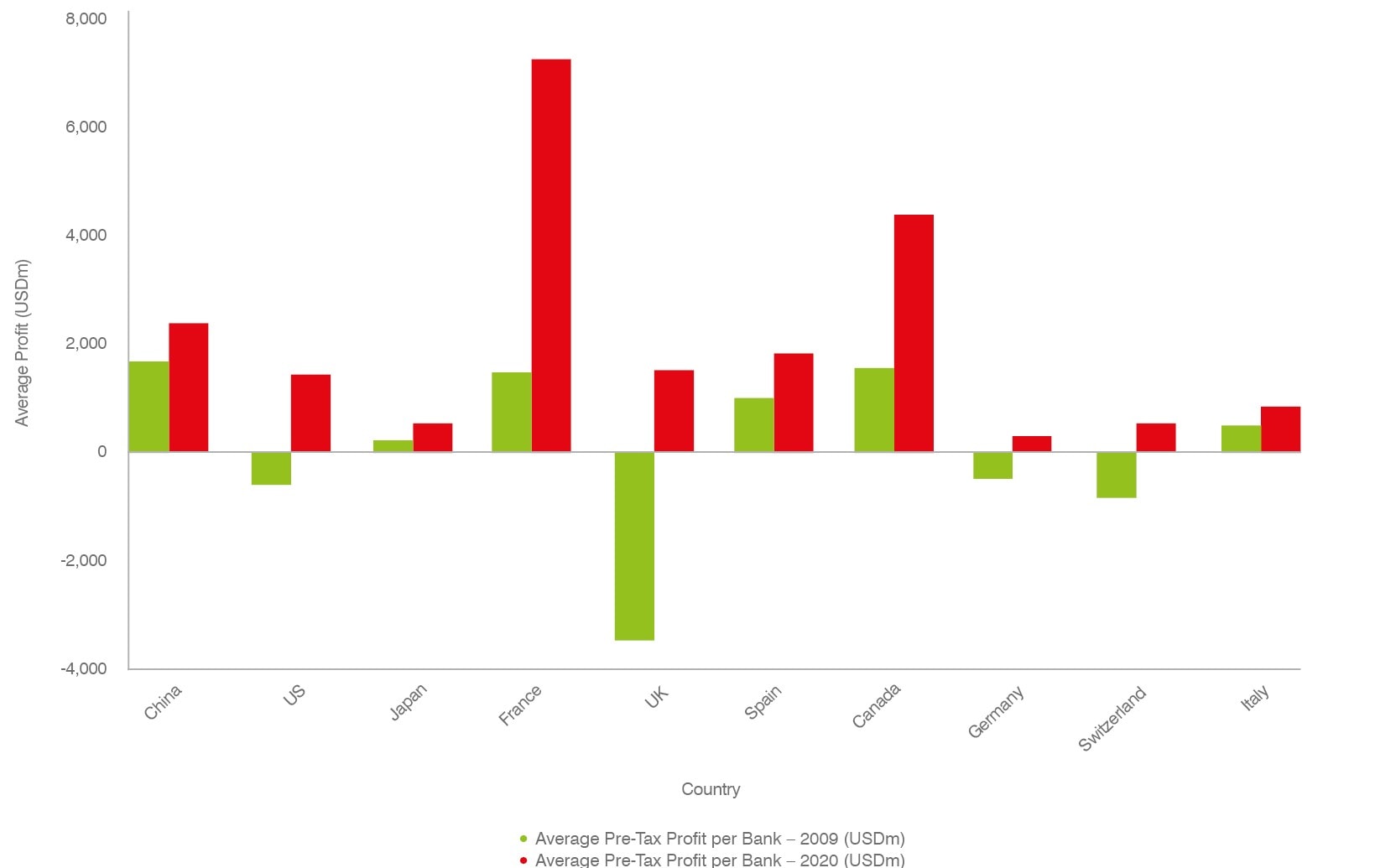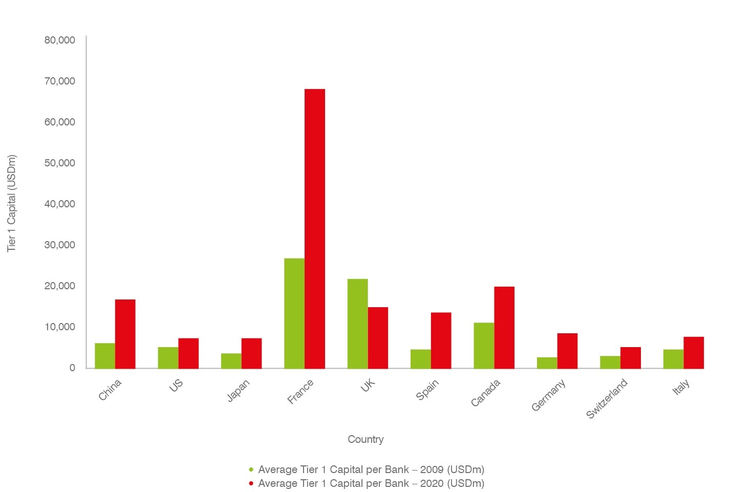 For example, looking at the average Tier 1 Capital (which is a core measure of a bank’s financial strength) and focussing on the countries with the largest banking industries in the world, we can see the banks operating in each country have increased Tier 1 Capital substantially since 2009 (except for the UK):