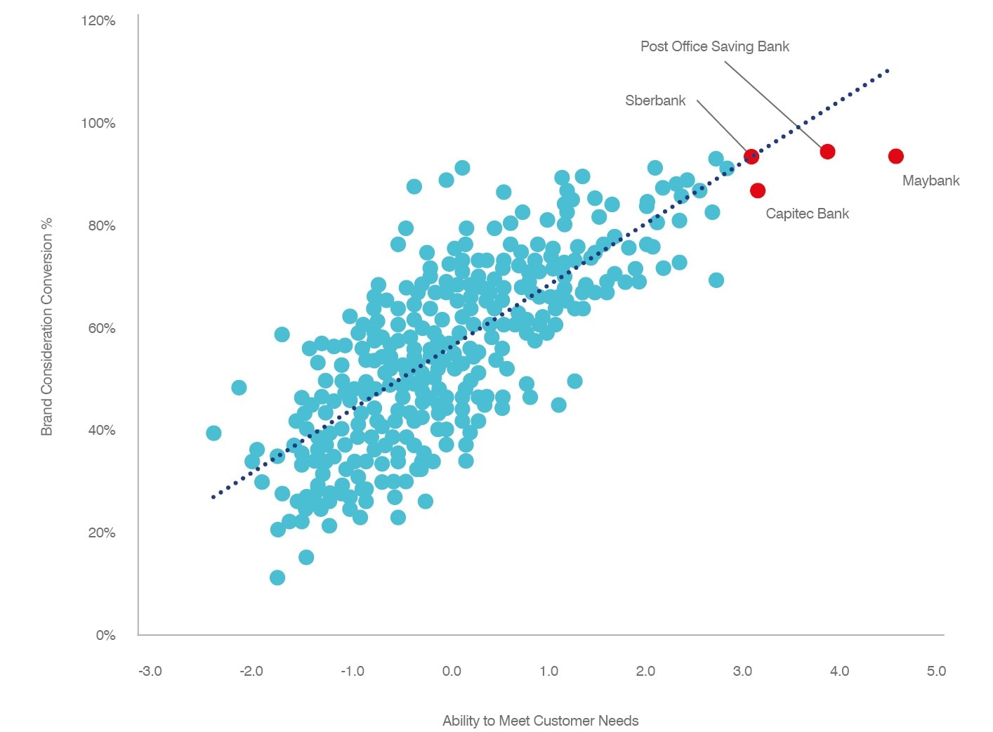 Examining the ability of a bank to meet customer needs, we can see that the banks that outperform in reputation also outperform in brand consideration: