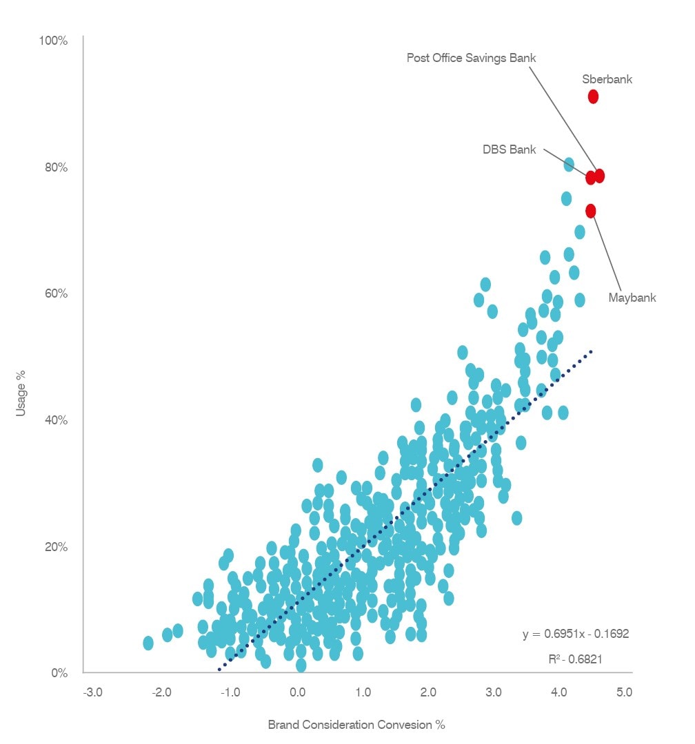 Why is brand consideration important? Brand consideration is highly correlated with brand usage (market share), where increased consideration is a lead indicator of usage: