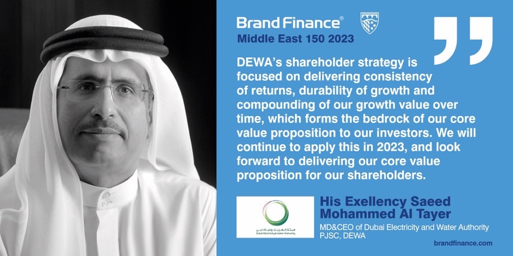 Dubai Electricity and Water Authority, DEWA (brand value up 30% to US$1 billion), is the second most valuable Middle Eastern utilities brand. The brand saw an increase in net profits in 2022 as it continued to supply Dubai’s rapid increase in demand for its services.
