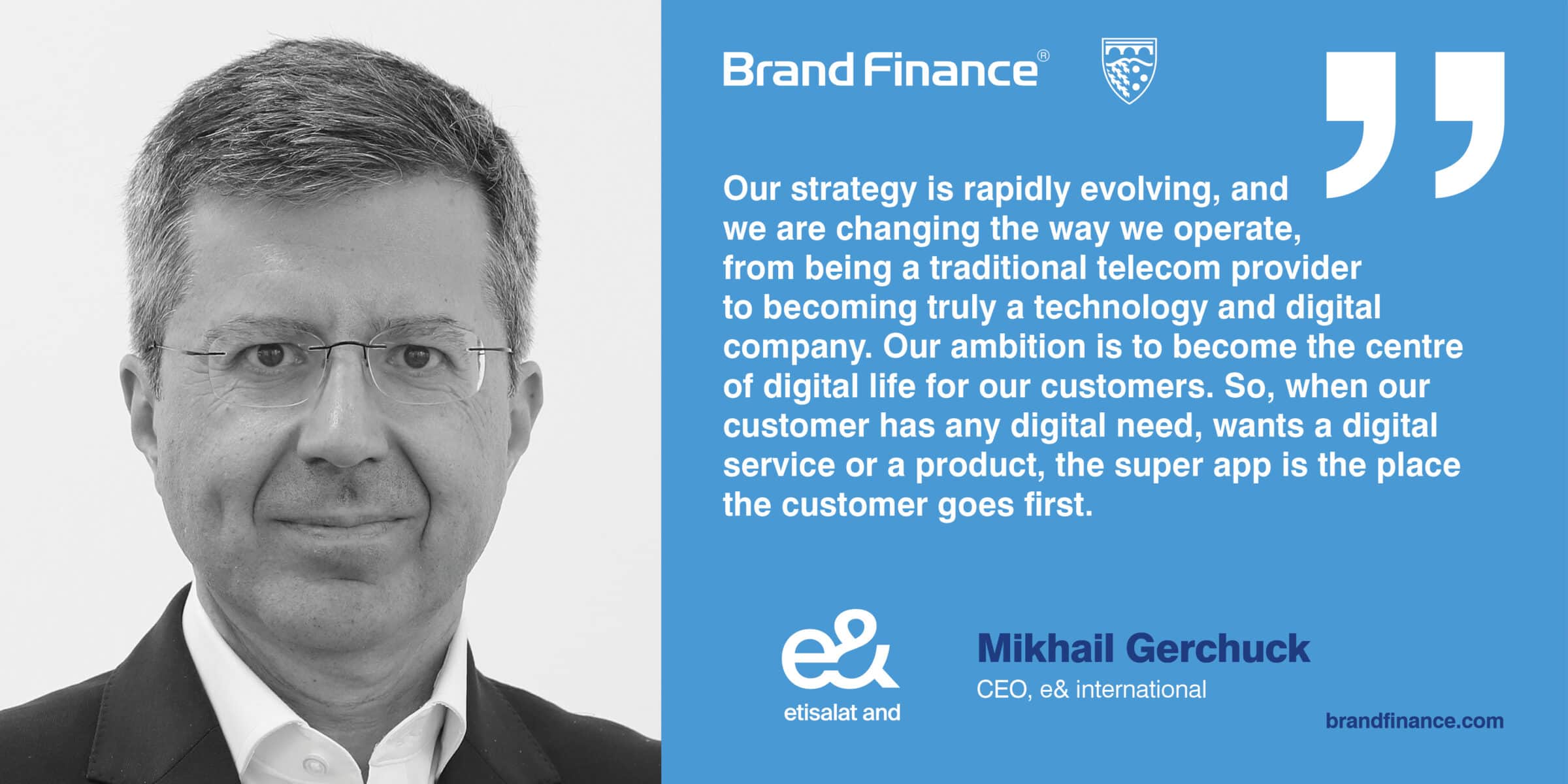 Richard Haigh, Managing Director of Brand Finance, recently sat down with Mikhail Gerchuk, CEO of e& international, to discuss e& international’s strategic priorities and the CEO's experiences over the past 16 months.