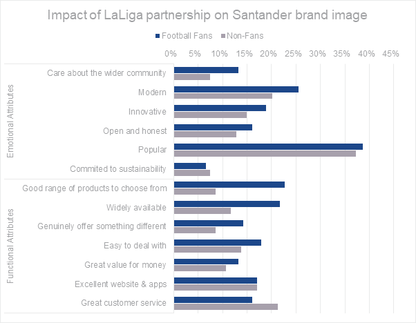 Santander’s partnership has no doubt been successful for the Spanish banking brand; Brand Finance’s 2022 consumer research shows consideration of the bank boosted to 53% among football fans, compared to only 35% among non-fans. The partnership has also had a positive effect on the brand’s image, for both emotional and functional attributes, notably ‘caring about the wider community’. The Santander brand was valued by Brand Finance in 2022 at €13.3bn, making it the most valuable Spanish brand and well ahead of LaLiga’s €653m brand value – however it is the strength and reach of the LaLiga brand that partners hope influences their own.