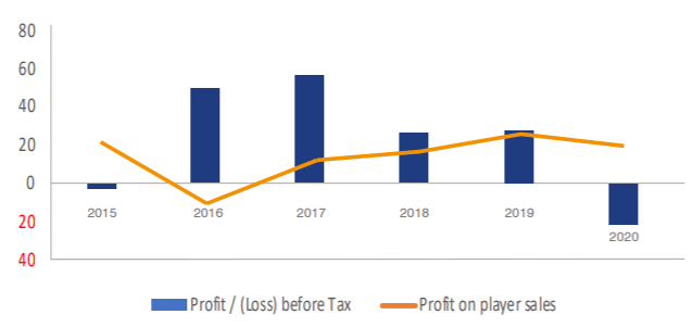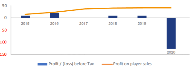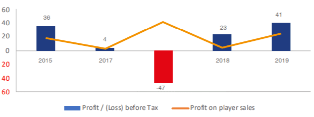 In 2020, Newcastle finished 13th in the Premier League, three places lower than the previous season. Yet, their profit before tax improved by £18 million. The year-on-year profit increase from 2018 to 2019 is largely attributable to the shrewd sale of players during the transfer window. Unfortunately, Newcastle United have yet to release the 2020 annual report, so it remains to be seen how severe the impact of COVID-19 has been on the financial state of the club. With the possible exception of a COVID impacted 2020 and a relegation impacted 2017, Newcastle have been consistently profitable over the last 5 years.