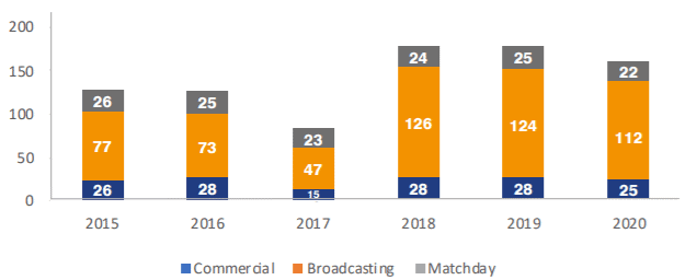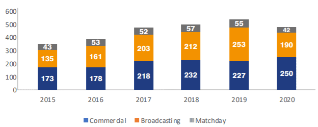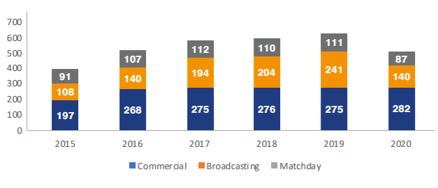 Since 2015, Manchester City has grown its revenues at a compound annual rate of 27%. 2019 was a record year in terms of revenue, with the club reporting total revenue of €590 million (£535 million). According to the latest available financial statements, which includes three months of COVID impacted football, City experienced an expected decline in revenues. Growth in revenue over the past 5-year term is largely attributable to excellent on field performances which generated a higher share of Premier League broadcasting revenue and has ultimately attracted better commercial deals from sponsors, such as the lucrative 10-year Puma deal with a reported £650 million.