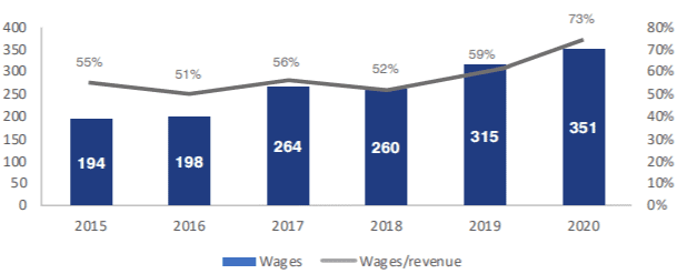 Manchester United has managed to maintain a healthy level of profit, except for the COVID affected 2020 financial year end. This can largely be attributed to the significant revenue generating capabilities of the brand and a relatively in-check wage/revenue ratio (49%).