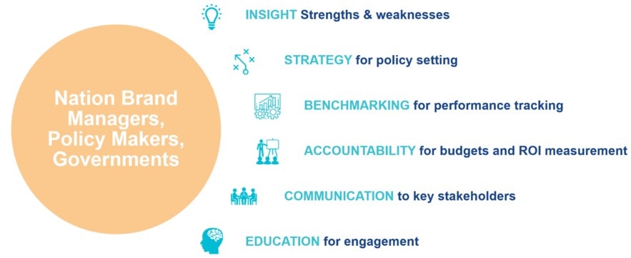 Benchmarking and accountability are important to ensure projects deliver tangible returns. Another key application of soft power and nation brand strength data concerns communication and education. In some cases, soft power and nation brand strength may be constrained because of poor communication of a nation’s strengths and resources. However, this is often easily addressed with a communications strategy.