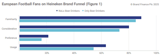 Brand Finance research also reveals that non-alcoholic beer drinkers have higher ad recall than the general population across the leading brands, being Guinness, Peroni, BrewDog, Corona Extra, and Beck’s. A common thread among these brands is their strong presence in sports marketing, promoting alcohol-free versions as official partners of major events. Several beer brands leverage football event and club partnerships to promote their NoLo products, driving engagement with this rapidly growing consumer base.