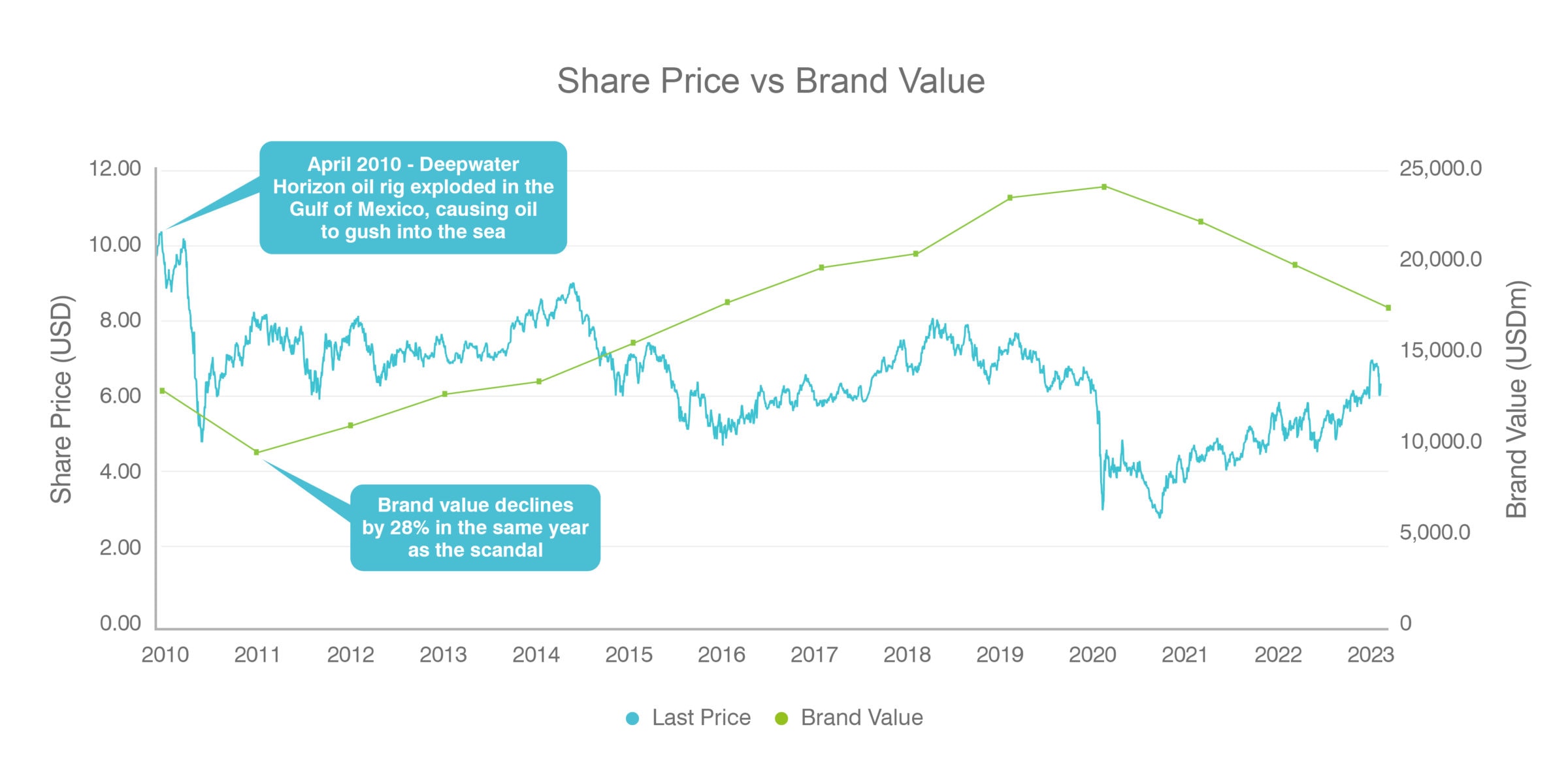 For example, most people are familiar with the Deepwater Horizon Oil Spill of 2010, for which Oil and Gas giant BP was responsible. The Deepwater Horizon oil rig exploded leaking nearly 5 million barrels of oil into the ocean – polluting water, destroying beaches, and killing wildlife. The spill is widely regarded as one the worst environmental disasters in US history. As a consequence, BP agreed to pay a record $19bn in fines, which remains the largest corporate settlement in US history. The total estimated clean up costs, charges, fines and penalties incurred by BP are estimated to have exceeded $65bn. In the immediate aftermath BP’s share price more than halved – and still has not recovered the share price value since. In the same year, at next valuation BP lost 30% of its total Brand Value.