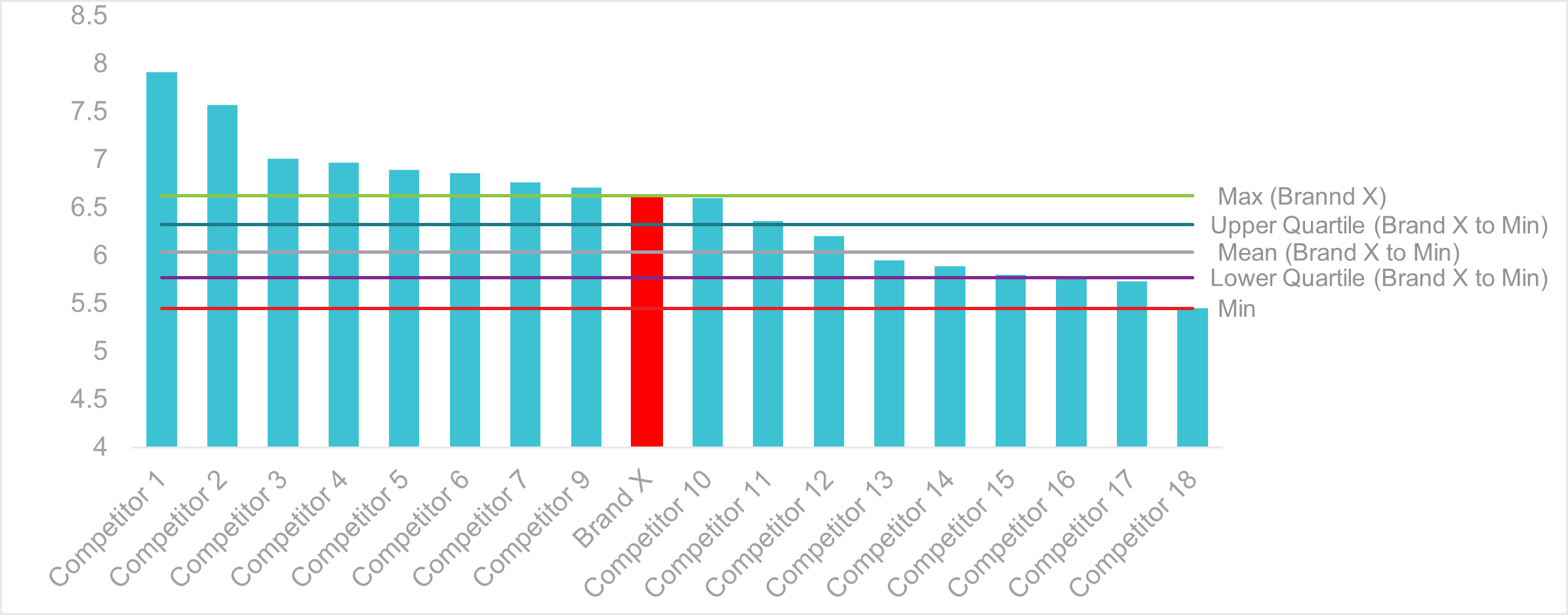 The Brand Strength Index consists of a series of metrics that underpin a brand’s health across a range of stakeholders. These metrics include but are not limited to emotional and functional drivers of choice, familiarity, consideration, NPS, reputation, ESG, market share, volume, and price premium. These metrics are benchmarked by industry on a global basis (underpinned by a global market research programme) and condensed into one comprehensive score expressed out of 100.