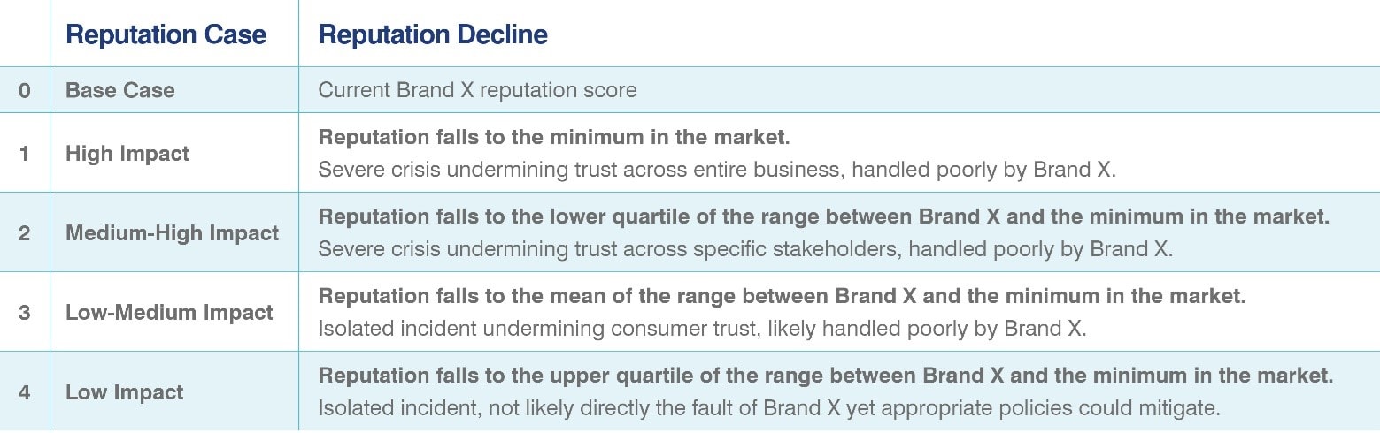 Once a base reputation score is established, a scenario analysis can be run, in which the extent of reputational damage can be estimated and modelled against other metrics within the Brand Strength Index and ultimately brand value: