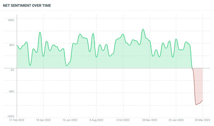 Having established a point of departure, we can now attempt to quantify the impact on reputation from the collapse of SVB. Given the uncertainty over whether the SVB brand itself has a future, Brand Finance is working on the assumption that immediately before the official closure of the bank, if the board has put in place adequate reputational risk governance procedures, then the brand would still have a future ahead of it. Without extensive market research across a wide range of stakeholders it is difficult to adequately quantify the extent of the reputational damage incurred due to poor governance. Therefore, certain tools can be utilised in place of market research to extrapolate reputational damage and measure the potential impact of a reputational event. Take social listening for example, the graph below displays net social sentiment online for SVB over the 12 months immediately prior to its collapse. Net sentiment refers to AI enabled opinion mining online, which analyses conversations to determine an emotional state. We can see that net sentiment declines significantly as the crisis unfolds in the mainstream media.