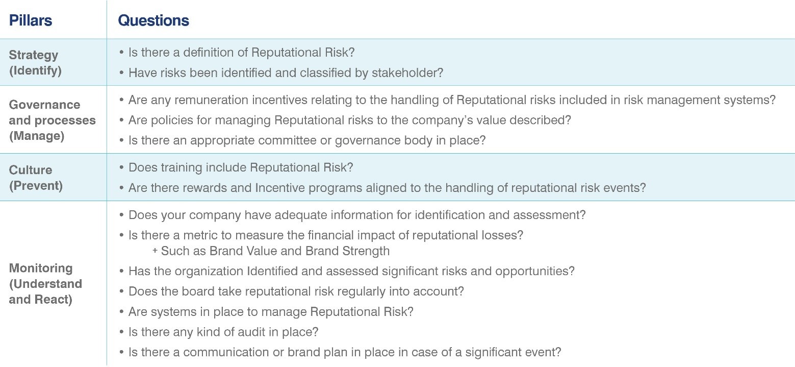 Ultimately reputation risk events can be mitigated with appropriate governance in place. Good governance will also account for appropriate responses once a reputational risk is identified. The following 4 pillars of reputational risk management (and associated questions) can help an organisation manage and mitigate reputation risk effectively: