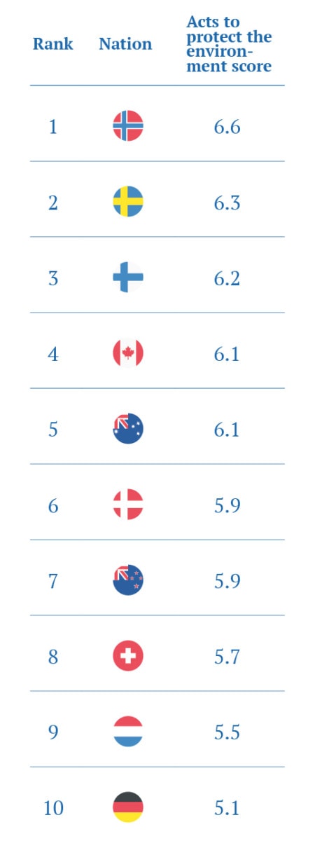 These high scores are directly correlated with the Environmental Performance Index. Scoring 6.6 out of 10 for acts to protect the environment in the general public survey, Norway is the best performing nation in this regard, with a sustainable and environmentally friendly ethos embedded into both policy and the Norwegian way of life. Planning to achieve carbon neutrality by 2030, the Norwegian government has made strident steps to tackle the climate crisis, most notably investing in cycling and public transport, tracking carbon dioxide emissions, and introducing tax exemptions for electric vehicles, as Norway now dominates in electric vehicle share around the world.