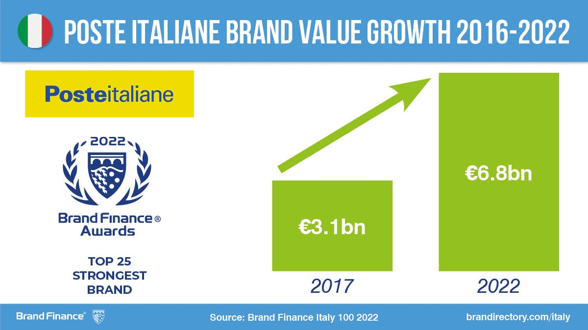 Grazie al forte incremento, Poste scala la Brand Finance Global 500, la classifica globale dei marchi ordinati per valore finanziario. Nel 2022 il marchio Poste scala 51 posizioni e si ritrova al 266°, appena sotto Ferrari (258°) e sopra TIM (284°). La classifica dei brand ordinati per valore è guidata da Apple con un valore pari a $ 355 miliardi seguita Amazon e Google.