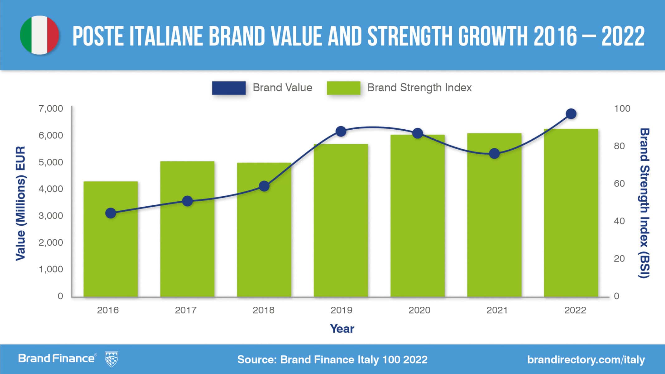 • Poste Italiane brand value increases by 26% year-on-year and by 16% compared to its value pre-covid, reaching US$7.8 billion.