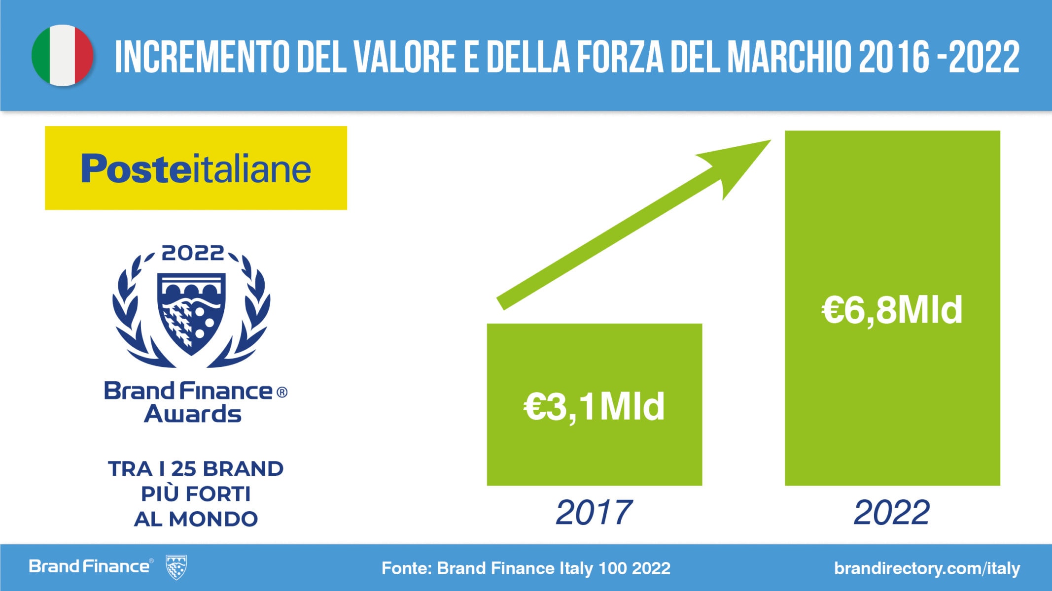 • Poste Italiane climbs 51 positions in the Brand Finance Global 500 2022, closely approaching Ferrari, valued at US$8 billion.