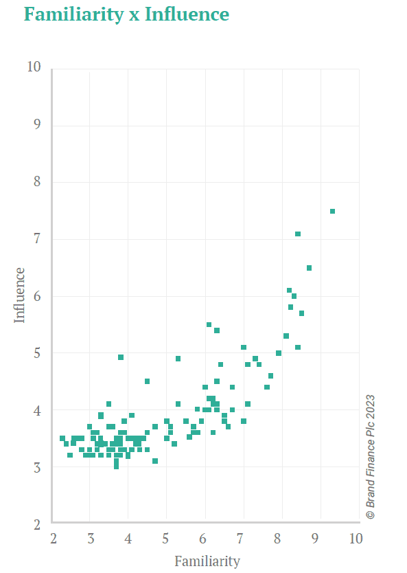 Familiarity and Reputation are correlated with Influence, but the relationships between these three KPIs (and their underlying drivers) is complex, and a balanced Soft Power strategy should always aim to fire on all cylinders.