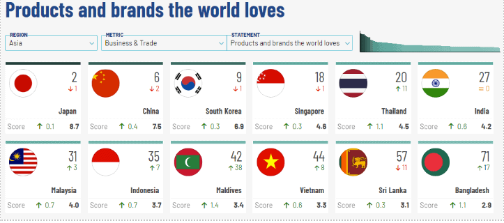 Malaysia (39th), Thailand (41st), and Indonesia (45th) all rank in the Top 50 globally too. Having become more familiar to people around the world as tourist destinations, they are simultaneously investing in developing strong corporate brands that are increasing their Soft Power internationally.