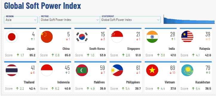 In ASEAN specifically, Singapore is leading the way in Soft Power, being a major financial hub and a role model for good governance for many nations in the region. In the world, it ranks 21st. In Asia, it is behind only Japan, China, and South Korea as well as ahead of much larger India.