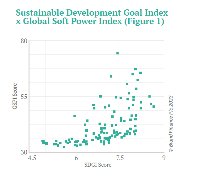 The analysis in Figure 1 shows the nations’ Global Soft Power Index scores (on the vertical axis) plotted against their score on the Sustainable Development Goal Index, an aggregate score on overall SDG progress performance based on dozens of different attributes.