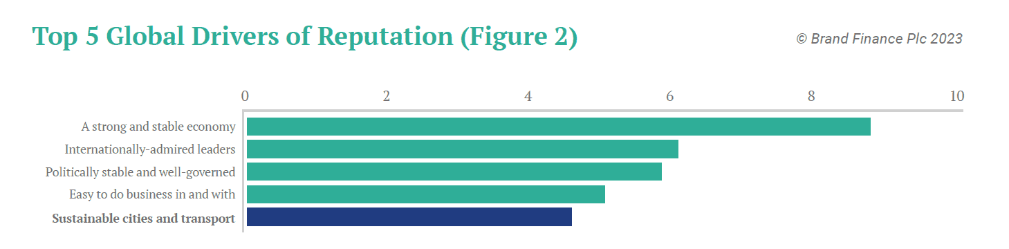 Economic and political stability are understandably core drivers of Soft Power, reflected in their positions as the 1st and 3rd most important drivers of national reputation (Figure 2). More surprising to some will be the powerful role of ‘pure’ sustainability attributes. ‘Sustainable cities and transport’ is the 5th most powerful driver, accounting for 4.6% of influence on reputation, while ‘invests in green energy and technologies’ is the 7th strongest driver (3.9%). These have a far more powerful role than attributes such as ‘influential media’ (1.4%) and even ‘influential in diplomatic circles’ (3.8%).