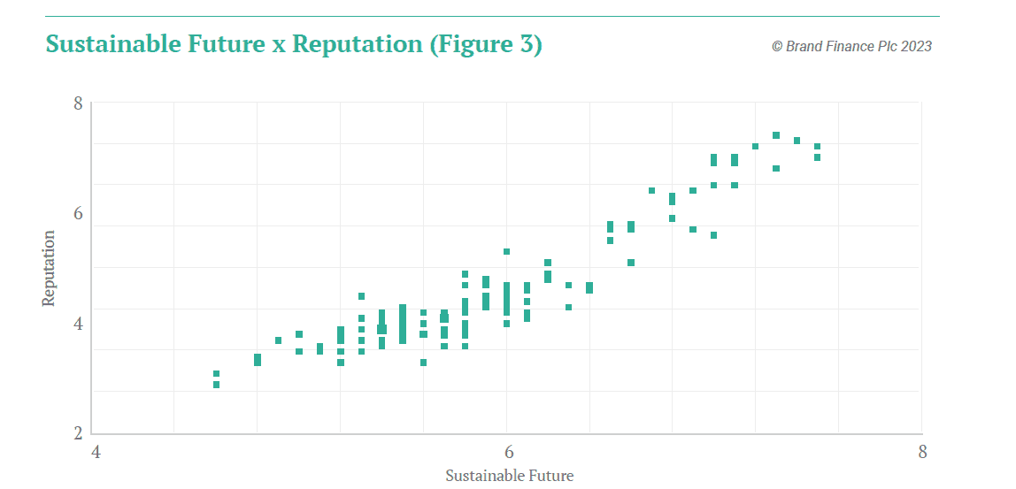 Looking at some outputs from Brand Finance’s online Soft Power dashboard, we can see clear relationships between sustainability and other key components of Soft Power. For example, in terms of Reputation, we see a correlation of r = 0.93.