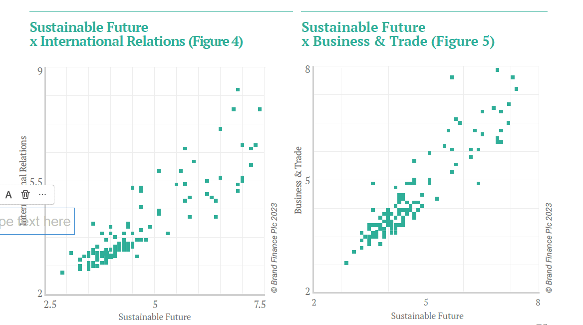 This influence on Reputation would appear to have tangible effects on the application of Soft Power too. There is a correlation r = 0.88 between sustainability and influence in International Relations, and a r = 0.92 correlation between sustainability and Business & Trade.