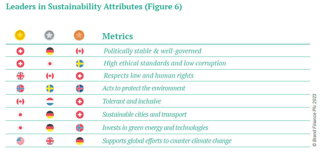 Turning to the nation brand-level results from this year’s Global Soft Power Index, Switzerland scores top on many specific measures of sustainability. for ‘high ethical standards and low corruption’ Switzerland receives the highest score of 7.03, just ahead of Japan on 6.99. Nordic countries, regular top performers on wide range of soft power metrics, also score well. Sweden is 3rd, Norway 4th, Finland 5th, and Denmark 7th (behind Canada).