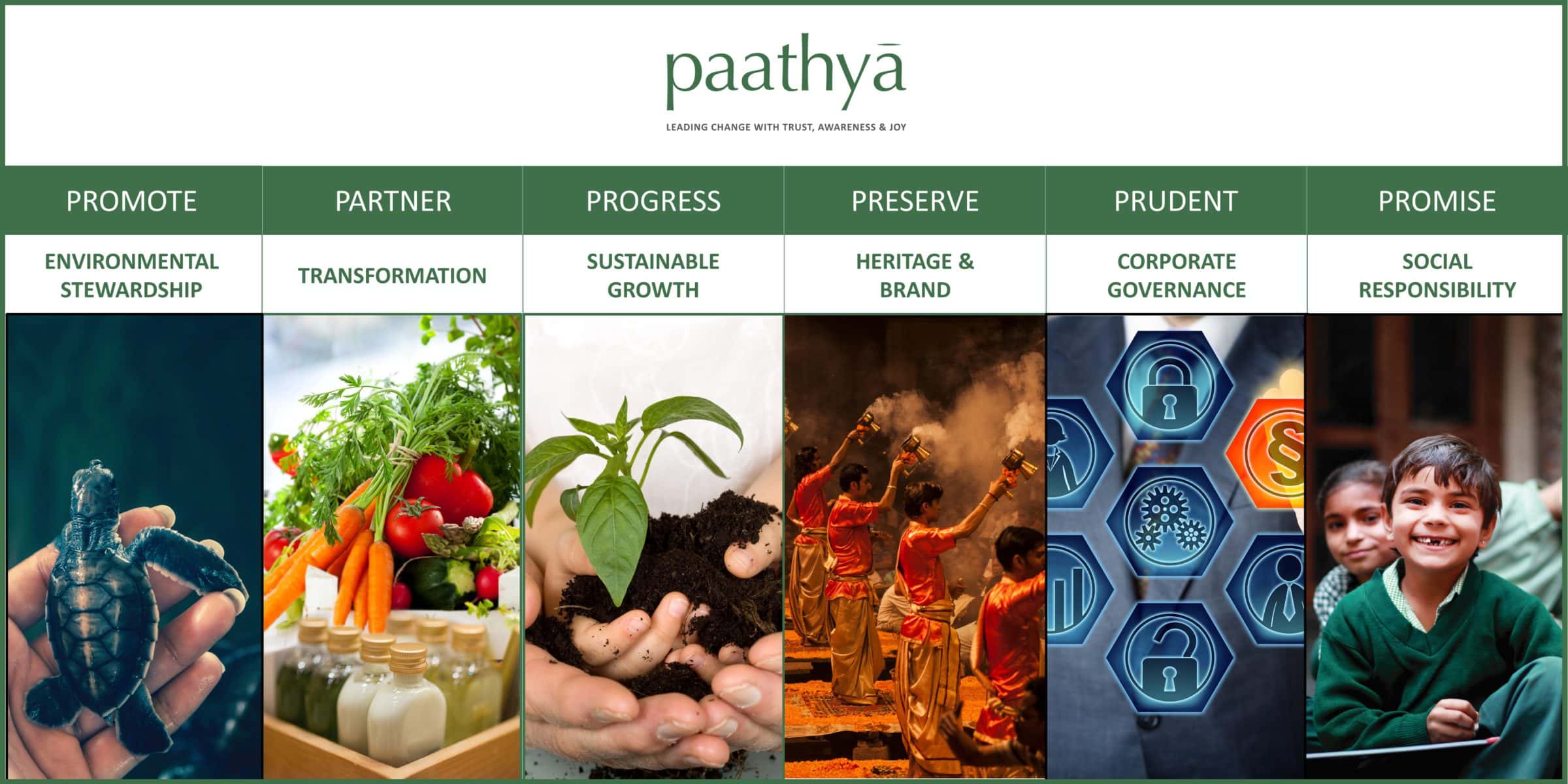 Inspired from the Sanskrit term पIथ्य, Paathya, inferring a path, is our roadmap to leading positive change with our core values of Trust of all stakeholders, Awareness around the needs of our ecosystem and Joy at heart. Taking ahead Taj’s over a century-old legacy, Paathya forges a journey focused on Environmental Stewardship, Social Responsibility, Excellence in Governance, Preserving Heritage, Value Chain Transformation and Sustainable Growth.