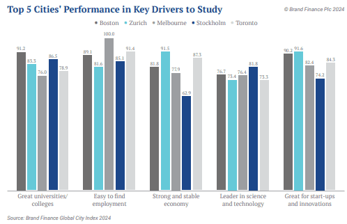 As cities around the world strive to attract international students and top talent, there are lessons that can be learnt from the success of Boston, Zurich, Melbourne, Stockholm, and Toronto who are currently ranked as the best cities for those considering where to study. These cities stand out for a multitude of reasons, such as academic prestige, cultural richness, and professional opportunities, making them prime destinations for students. This may also entice them to stay after completing their studies.