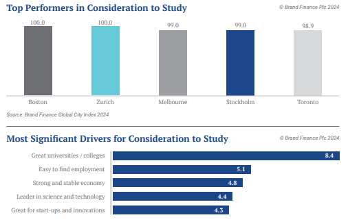 Looking beyond the top 5 drivers of consideration to study, we identified several other city brand attributes that the best study destinations have scored particularly high on.