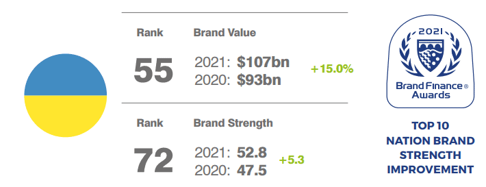 Ukraine’s performance in the Brand Finance Nation Brands 2021 study impresses with solid gains across both brand strength and value. In brand strength, the nation has seen a +5.3 point improvement - one of the 10 biggest improvements in the study this year - and climbed 17 ranks over the past year. In brand value, Ukraine has defended its 55th place, following a 15% increase from US$93 billion in 2020 to US$107 billion in 2021, rebounding over the US$100 billion mark post-COVID.