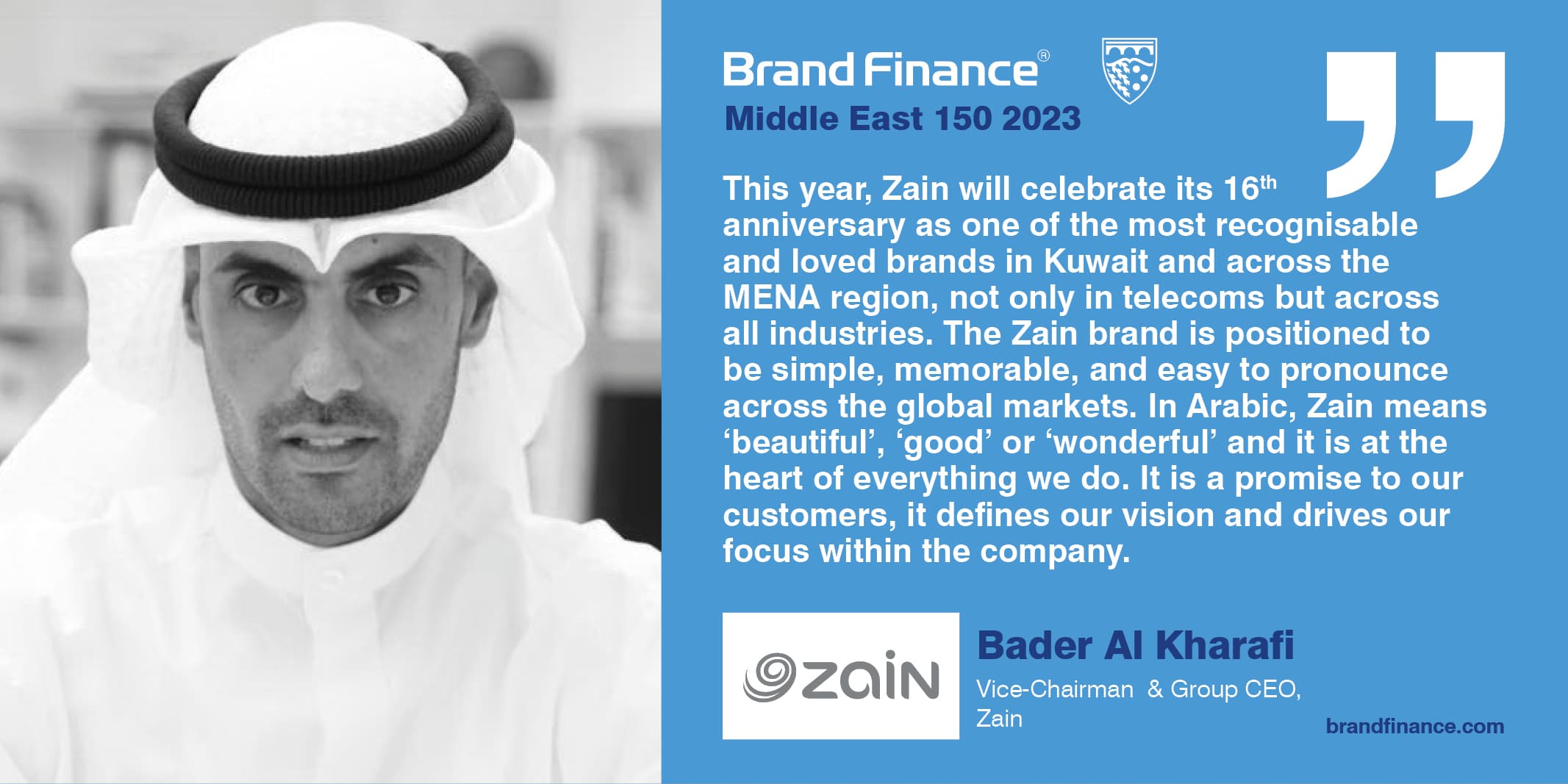 This year, the Zain brand will celebrate its 16th anniversary as one of the most recognizable and loved brands in Kuwait and across the MENA region, not only in telecom but across all industries. The Zain brand is positioned to be simple, memorable, and easy to pronounce across the global markets. In Arabic, Zain means ‘beautiful’, ‘good’ or ‘wonderful’ and it is at the heart of everything we do. It is a promise to our customers, it defines our vision and drives our focus within the company.