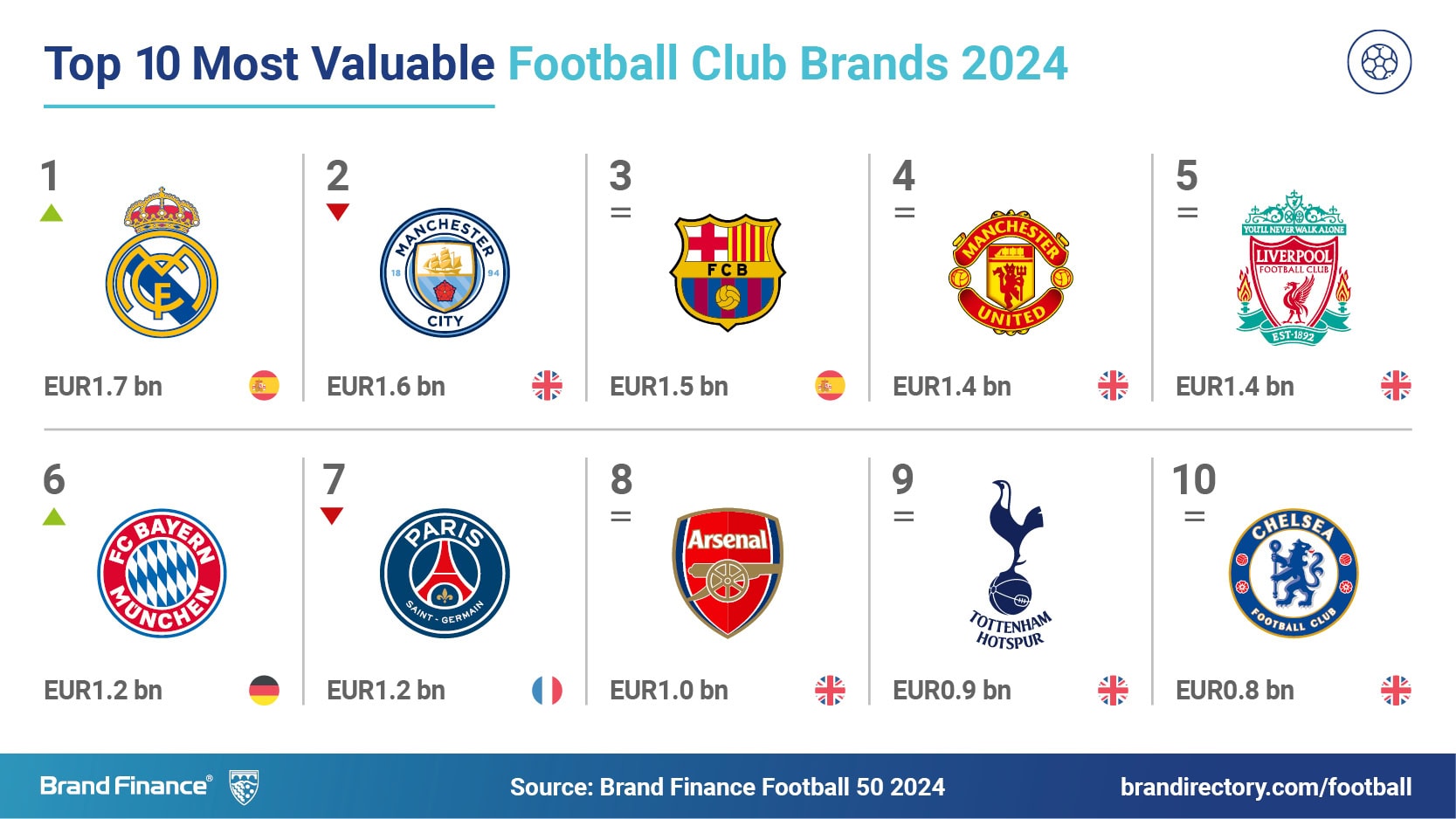 Real Madrid (brand value up 16% to EUR1.7 billion) has reclaimed its title as the world’s most valuable football club brand, surpassing 2023’s winner Manchester City FC, which saw a smaller growth of 7% to EUR1.6 billion and now holds 2nd place. FC Barcelona (brand value up 12% to EUR1.5 billion) has retained 3rd place in the ranking despite ongoing financial challenges.