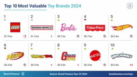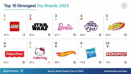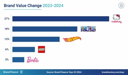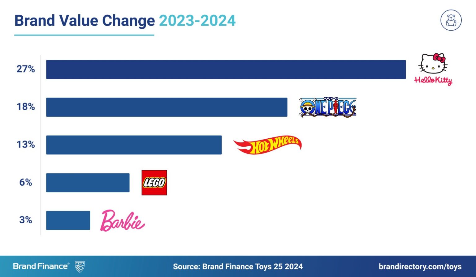 Japanese toy giant Hello Kitty is the fastest-growing toy brand in 2024, increasing its brand value by 27% to USD208.5 million. The brand continues to enjoy massive exposure and popularity in its home market, which has fuelled strong sales growth in recent years. Behind Hello Kitty, One Piece is the second-fastest-growing toy brand, with its brand value up 18.5% to USD132 million.