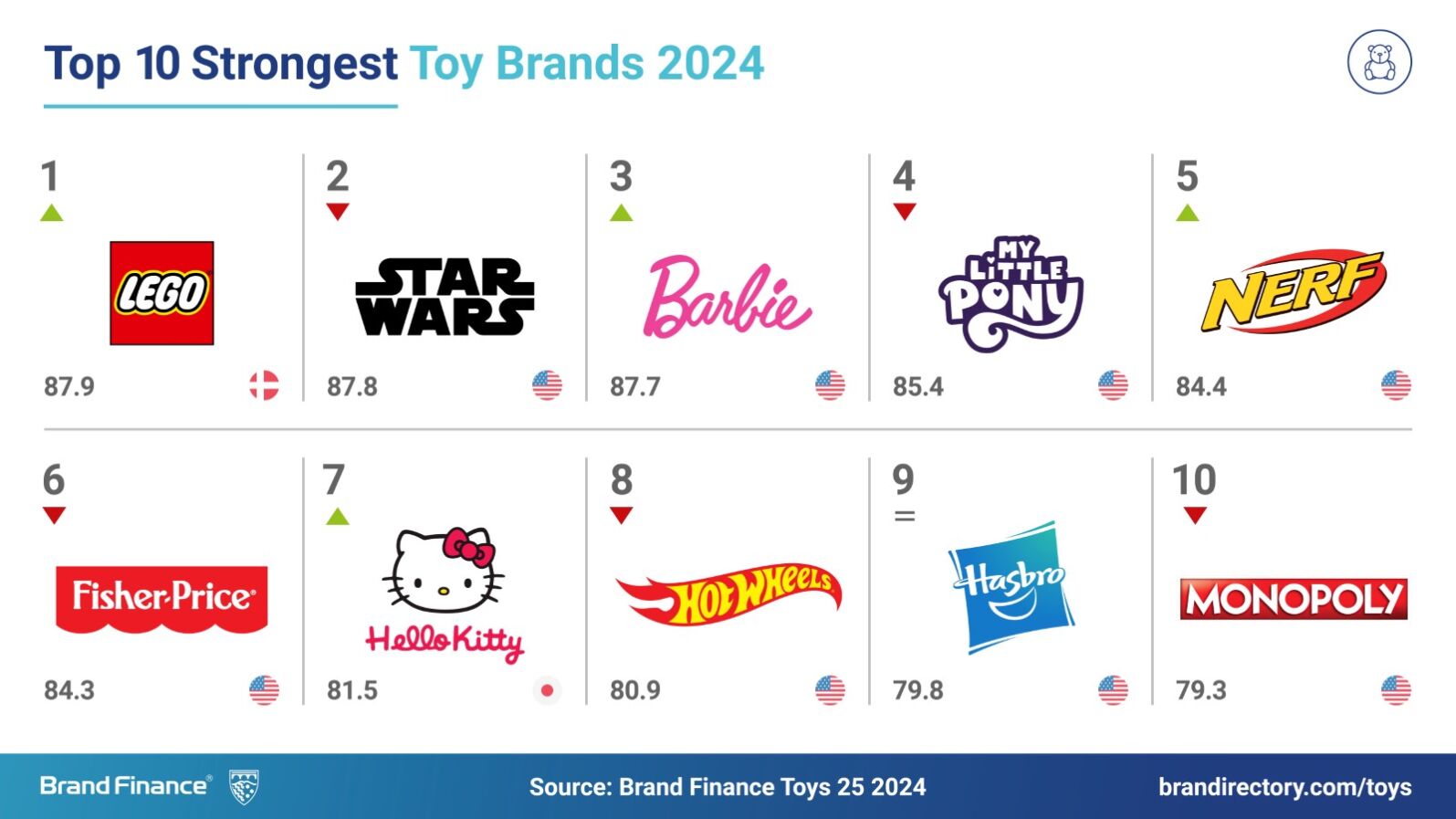 LEGO is the world’s most valuable toy brand for the tenth year running, increasing its brand value by 6.5% to USD7.9 billion. Fuelled by a year of solid sales growth, the brand has opened 147 new Lego-branded stores worldwide, bolstered its digital presence, and rolled out innovative new product lines. As one of the world's most recognisable toy brands, LEGO's enduring dominance at the top of the rankings also underscores decades of built-up brand equity and enduring nostalgia that continues to resonate with consumers across the globe. As such, it has become the world’s strongest toy brand in 2024, with a BSI score of 88/100.