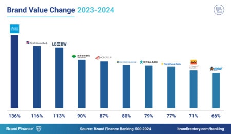 Only 11 of the top 50 countries experienced decreases in aggregate value, led by Russia (69%), Malaysia (20%), and Nigeria (14%). Unsurprisingly due the international sanctions imposed on Russia, the country’s two largest bank brands – VTB and SBER – have suffered the biggest falls in brand value by percentage, with 91% and 63% plunges, respectively.