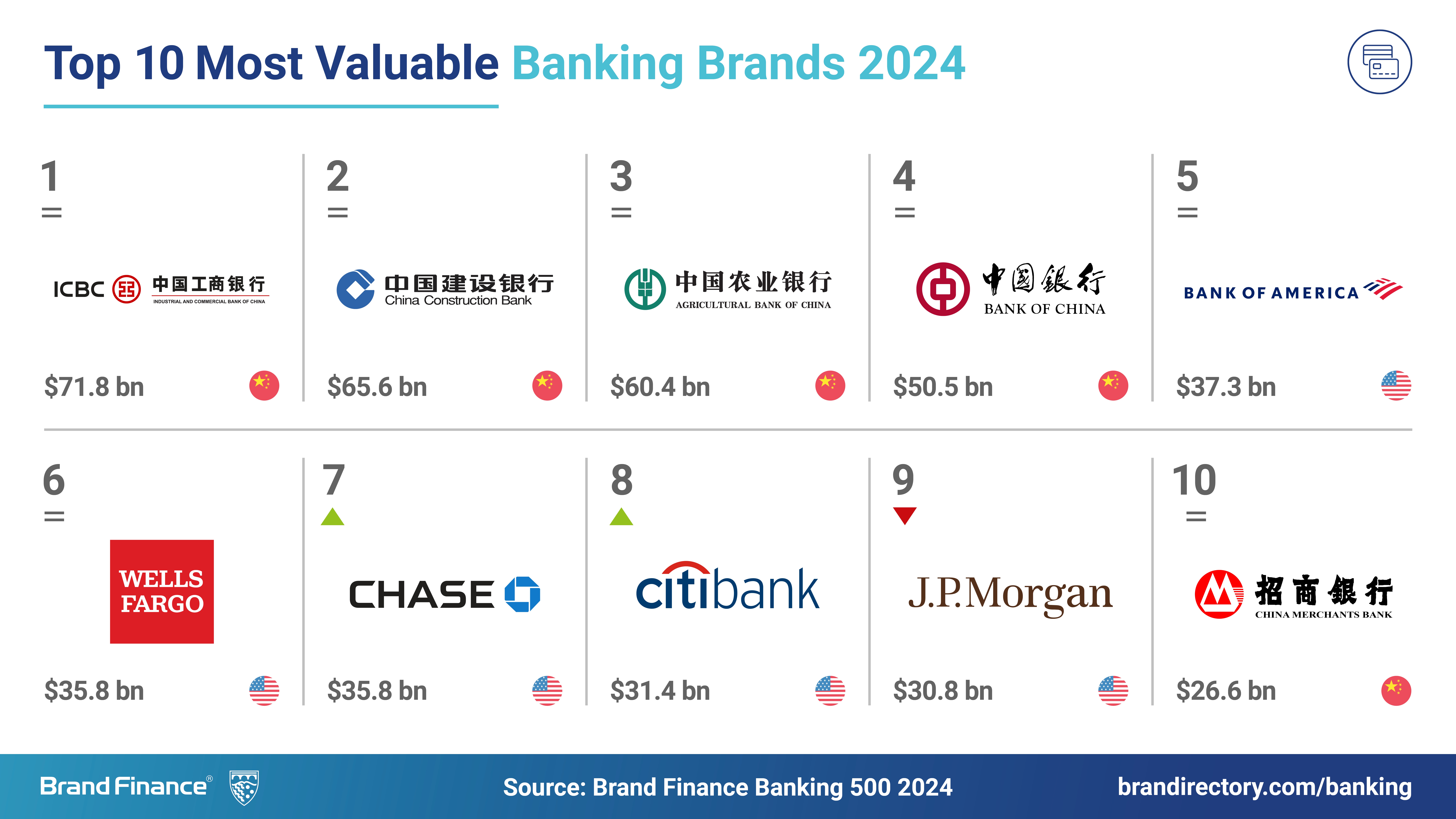 The Chinese banking sector demonstrates a notable recovery, with the 'big four' banks remaining well ahead of their US counterparts. ICBC (Industrial and Commercial Bank of China) maintains its position as the world's most valuable banking brand for the eighth consecutive year, boasting a 3% rise in brand value to USD 71.8 billion. China Construction Bank, Agricultural Bank of China, and Bank of China secure second, third, and fourth positions, respectively, following single-digit percentage increases in each of their brand values.